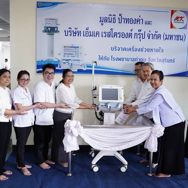 พฤษภาคม : มูลนิธิป้าทองคำ เอ็มเค มอบ เครื่องช่วยหายใจ มูลค่า 550,000 บาท ให้แก่ โรงพยาบาลท่าตูม จ.สุรินทร์ ช่วยผู้ป่วยทางเดินหายใจล้มเหลว (ภารกิจที่ 2)